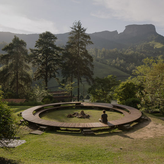 Talvez o espaço do fogo seja o primeiro espaço: ao redor dele se organizam os corpos, o tempo e a palavra. O novo desenho transforma a fogueira em uma bússola: uma rosa dos ventos materializada no chão. São doze apoios marcando as direções, como um relógio solar que ensina o tempo pelo movimento da luz. Um palco se orienta para o sul, apontando diretamente para a Pedra do Baú — marco geográfico da região e referência constante na paisagem.