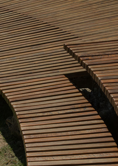 O conjunto é construído com materiais locais: bancos ripados de eucalipto cortado e apoios estruturados com pedras recolhidas no próprio terreno. A materialidade reforça a relação com o chão e com a paisagem.