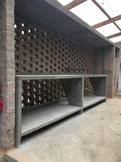 Devido a legislação ambiental local, não é possível construir obras novas na região próxima aos rios e, portanto, foi necessário preservar a volumetria existente. Para isso, aproveitamos o embasamento existente e construímos dois volumes laterais soltos do chão para dificultar o acumulo de umidade e entrada de animais em um ambiente que precisa ser aberto para circular vento e secar as roupas. Nesses dois volumes, construídos de tijolos vazado de forma a permitir uma circulação cruzada, concentramos os armários do deposito, o banheiro e as bancadas de trabalho com as maquinas de lavar e secar.