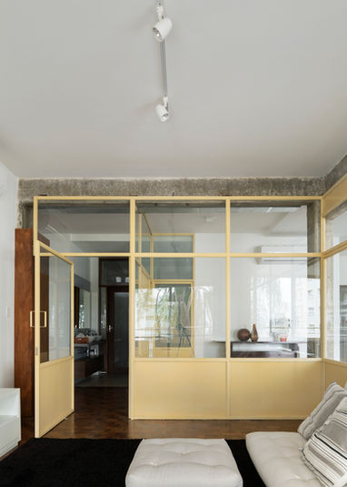 Informados por los cierres de metal amarillo en la fachada del edificio, decidimos continuarlos en el interior del apartamento para recomponer los nuevos ambientes. Es a través de esta inserción de un elemento arquitectónico lineal que calibra la escala, el acceso, la intimidad y las funciones de los entornos construidos que se lleva a cabo el proyecto de renovación.